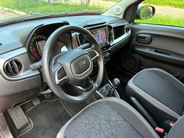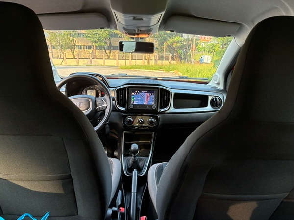Entre os itens presentes estão central multimídia Uconnect de 7 polegadas; integração com Android Auto e Apple CarPlay; sensor de estacionamento traseiro; volante multifuncional; direção elétrica; ar-condicionado, além de vidros e travas elétricas. Para quem procura um carro simples, mas com conectividade básica, o conjunto atende bem.