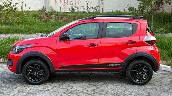 A versão Trekking aposta em um visual mais robusto para se destacar dentro da gama. O carro traz adesivos laterais exclusivos, molduras plásticas nos para-lamas, rack de teto e acabamento interno diferenciado, elementos que ajudam a transmitir uma proposta mais jovem.