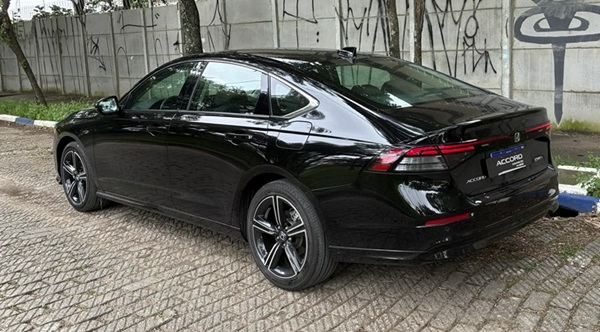Visualmente, o Accord evoluiu para um desenho mais limpo e sofisticado. A carroceria ganhou linhas horizontais bem marcadas, com frente dominada por uma grade ampla e conjunto óptico totalmente em LED. Na traseira, as lanternas interligadas reforçam o visual moderno, enquanto as rodas de liga leve exclusivas completam o pacote estético.