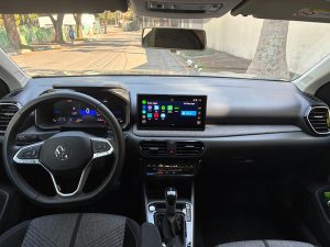 No visual, ele traz rodas de liga leve diamantadas, faróis full-LED e um acabamento interno que surpreende: painel digital de 8″, volante multifuncional com paddle shifts e central multimídia VW Play de 10,1″ com internet embarcada e apps nativos como Waze e Spotify. Tudo isso já na versão Comfortline. Faz falta a câmera de ré, equipamento já comum em modelos bem mais básico e só disponível de série a partir do Highline. Tenta compensar com sensores, mas não é a mesma coisa.