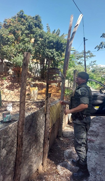 Durante patrulhamento pela região, a equipe encontrou seis gaiolas com os pássaros e um alçapão usado para captura criminosa em uma área próxima de mata. Nenhum responsável foi localizado.