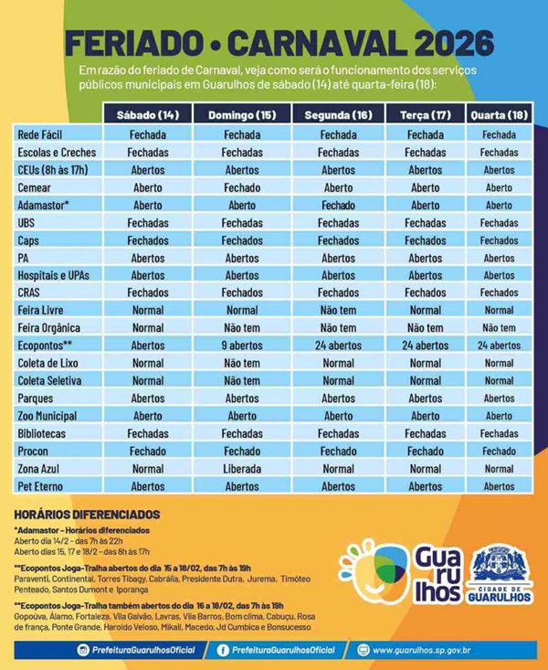 Guarulhos divulgou nesta quarta-feira (11) o funcionamento dos serviços públicos municipais durante o Carnaval, entre sábado (14) e quarta-feira (18). A administração orienta os moradores a verificarem previamente os horários específicos de cada equipamento antes de se deslocarem.