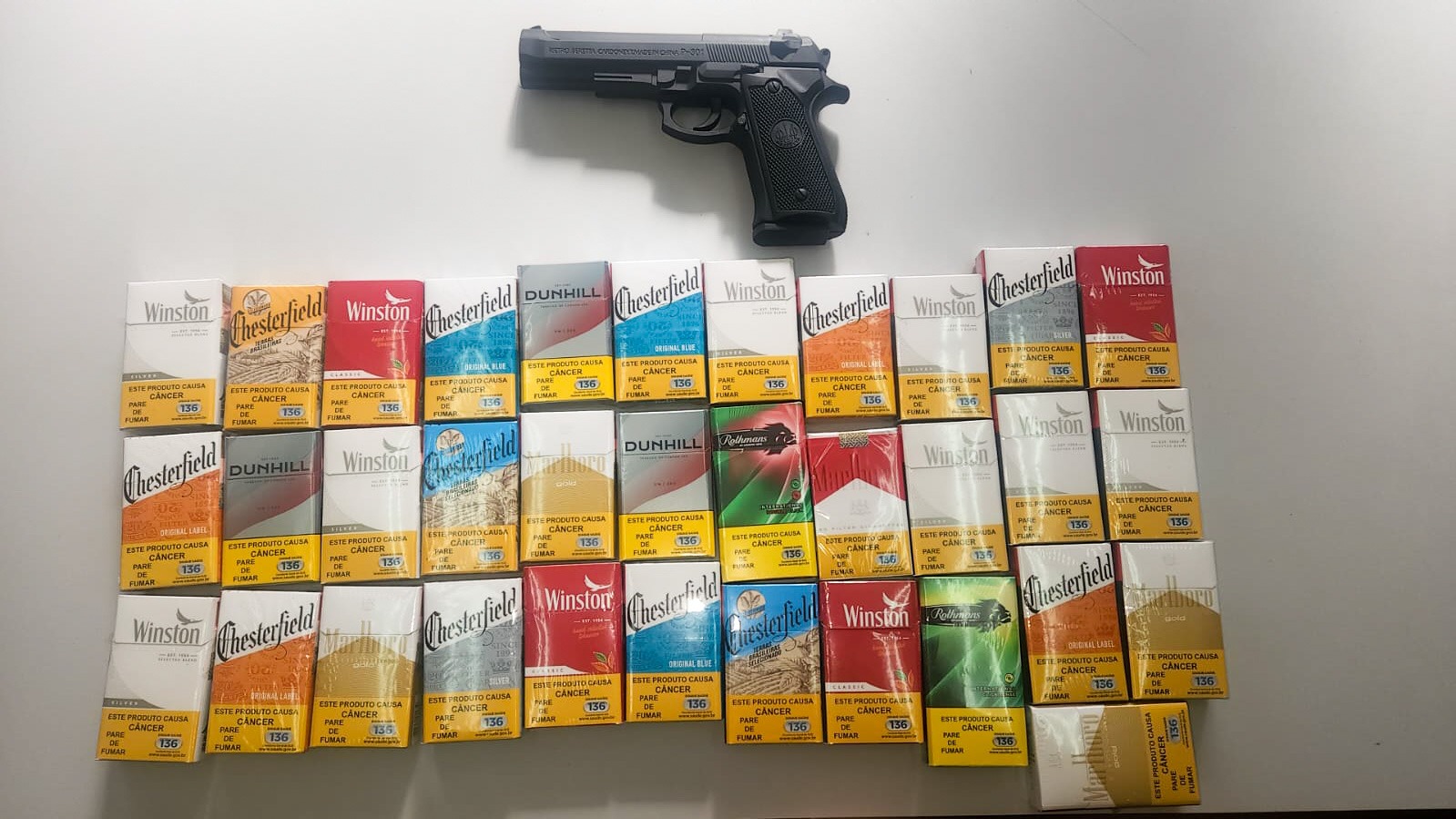 Durante a abordagem, um dos suspeitos foi encontrado no local e estava com um simulacro de arma de fogo. Na residência, os agentes também localizaram os produtos levados do supermercado.