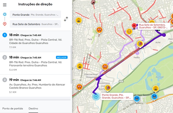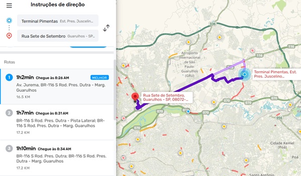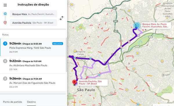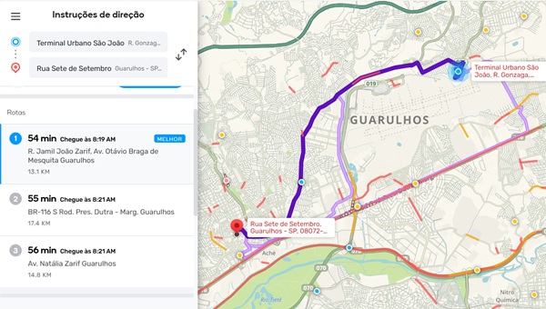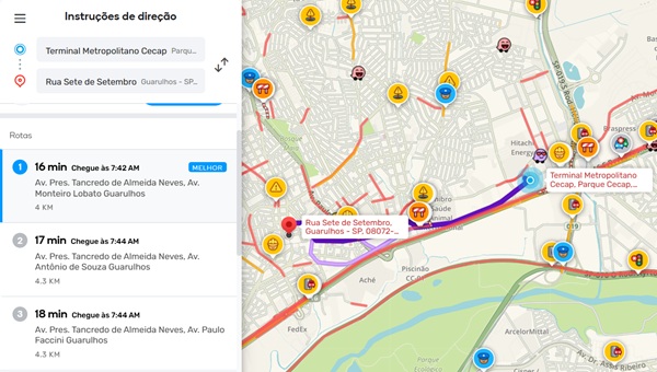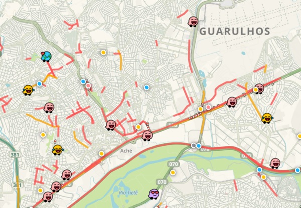 Confira as condições no trânsito na manhã desta terça-feira, dia 26, em Guarulhos, segundo o app Waze: