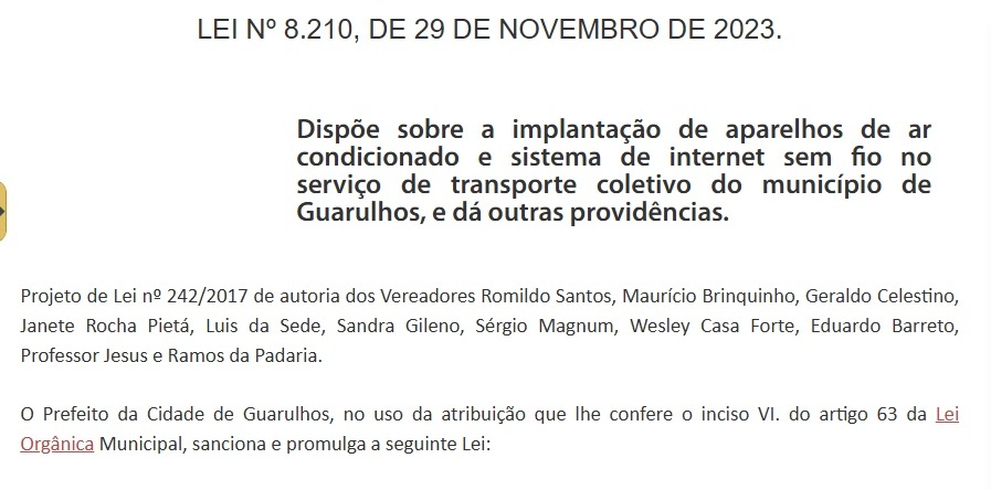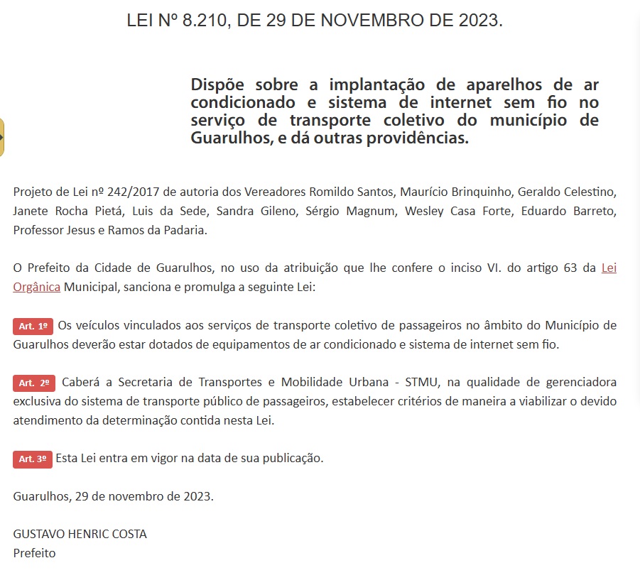 Lucas até pode até ter baixado um decreto. No entanto, a lei municipal 8.210, promulgada pelo ex-prefeito Guti em 29 de novembro de 2023, já determinava a implantação de aparelhos de ar-condicionado e sistema de internet sem fio no serviço de transporte coletivo do município de Guarulhos. Mas mesmo antes de se tornar lei, na gestão passada, ainda em 2021, a cidade recebeu os primeiros 50 ônibus com ar-condicionado.