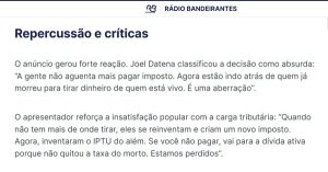 A própria emissora não botou muita fé na resposta oficial. E informou: “Embora a prefeitura tenha prometido o benefício, os critérios específicos para definir quem se enquadra nessa categoria ainda não foram divulgados, um ponto que gera expectativa e precisa de acompanhamento”, postou a Band.