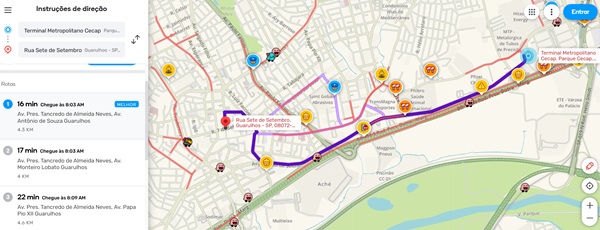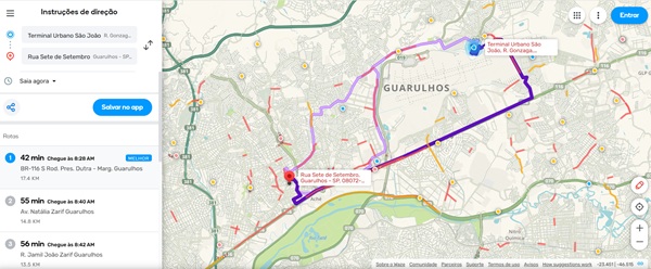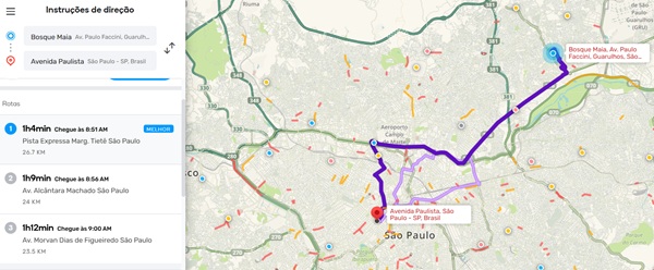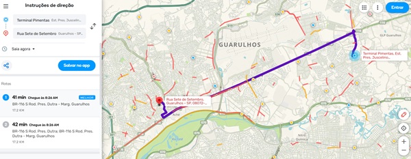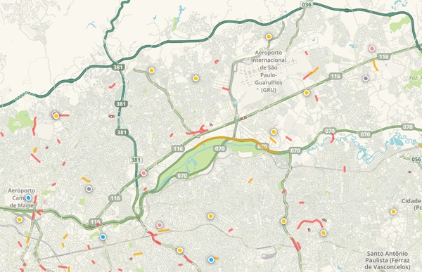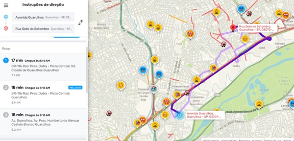 Confira como está o trânsito entre algumas regiões de Guarulhos na manhã desta sexta-feira (às 7h45), segundo o aplicativo Waze.