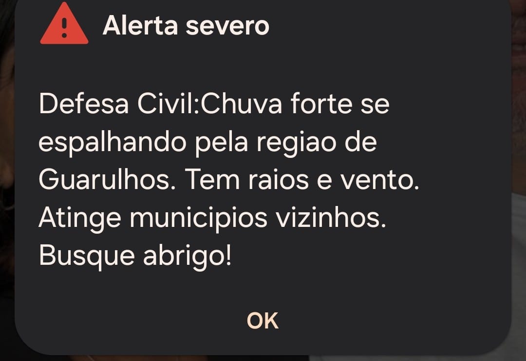 “Chuva forte se espalhando pela região de Guarulhos. Tem raios e vento. Atinge municípios vizinhos. Busque abrigo!”