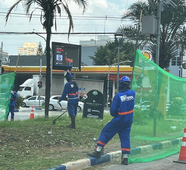 FLAGRANTE – Prefeitura faz zeladoria em canteiro adotado por empresa que explora publicidade