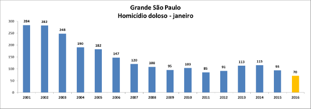 O recuo representa 23 casos de homicídio a menos. Em janeiro do ano passado foram 93 ocorrências, contra 70 no mesmo mês deste ano. Pela primeira vez na série, a quantidade de casos ficou abaixo de 80 registros.