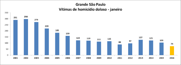 Considerando o número de pessoas vítimas de homicídio, houve diminuição de 28,16% – de 103 para 74. Foram 29 vítimas a menos em janeiro deste ano, em comparação ao mesmo mês de 2015. O total também é o menor da série.