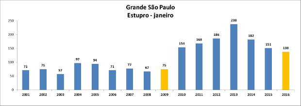 Os estupros também recuaram em janeiro, com 8,61% casos a menos na comparação com o mesmo período de 2015. O total baixou de 151 para 138 ocorrências do tipo.