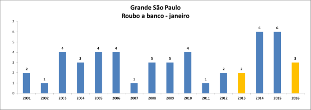 Com queda de 50% e três ocorrências a menos, a Grande SP teve a menor quantidade de roubos a banco registrada desde 2013. O primeiro mês de 2016 teve três ocorrências do tipo, ante seis no mesmo período de 2015.