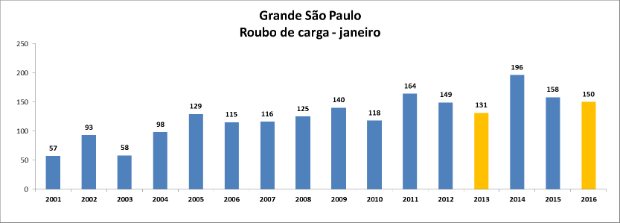 Em janeiro, os roubos de carga tiveram a menor quantidade de casos registrada desde 2013, na Grande SP. Foram contabilizados 150 casos, ante 158 no mesmo mês do ano passado. A redução foi de 5,06% ou oito registros.