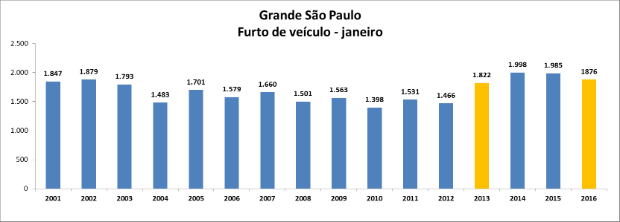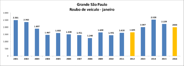 Os roubos de veículos caíram 10,27% e tiveram o menor número de casos desde 2012. Em janeiro houve 2.000 roubos de veículos, ante 2.229 no mesmo mês de 2015. Janeiro deste ano teve, portanto, 229 casos a menos.