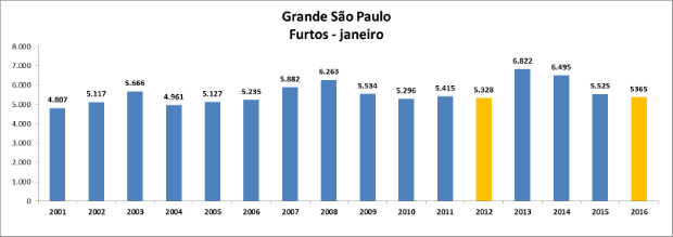 Os furtos em geral ainda reduziram 2,9%. Foram 5.365 ocorrências do tipo em janeiro deste ano, ante 5.525 no mesmo período do ano passado. O total é o menor desde 2012, quando houve 5.328 casos.
