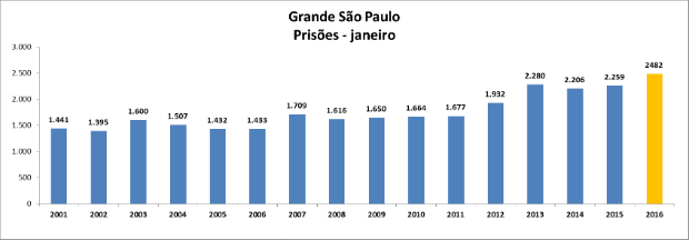 Os casos de extorsão mediante sequestro ficaram zerados em janeiro, ante uma ocorrência no mesmo mês de 2015.