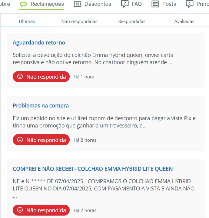 O caso desse consumidor não é isolado. No site ReclameAqui, a Emma acumula 8.497 reclamações registradas por consumidores brasileiros, que relatam problemas semelhantes, como atrasos, dificuldades de troca e falta de assistência. Mesmo com a alta demanda de queixas, a empresa ainda leva, em média, mais de nove dias para responder cada caso, o que gera ainda mais insatisfação e desconfiança entre os clientes.