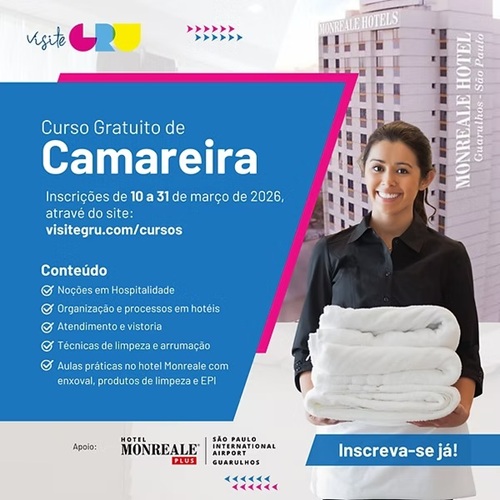 Estão abertas as inscrições para uma nova turma do Curso Gratuito de Camareira em Guarulhos. A capacitação é promovida pelo Visite GRU em parceria com o Monreale Plus São Paulo International Airport e oferece formação presencial com carga horária de 30 horas.