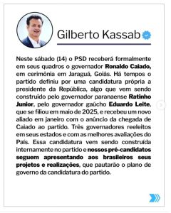 A declaração foi feita em redes sociais e indica que o PSD está na fase final de articulações para definir se lançará candidatura própria ou apoiará outro projeto nacional.