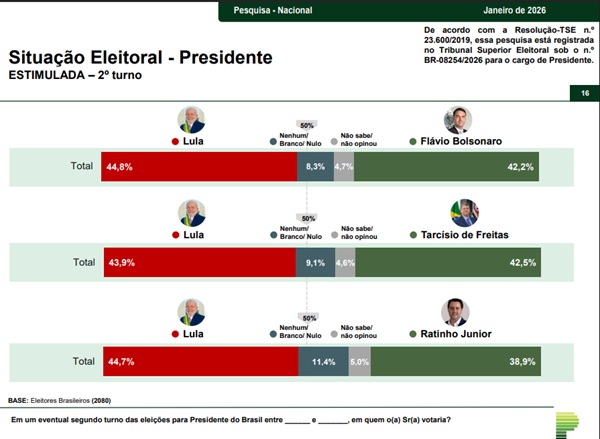 Esses dados mostram que tanto Tarcísio de Freitas quanto Flávio Bolsonaro estão tecnicamente empatados com Lula em um segundo turno, cenário que pode se consolidar caso nenhum dos candidatos alcance mais de 50% dos votos válidos no primeiro turno.