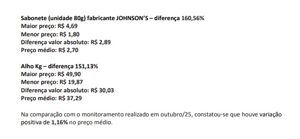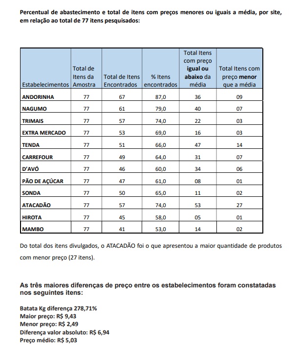 A coleta foi feita nos dias 17, 18 e 19 de novembro, comparando preços de 30 tipos de produtos essenciais em pelo menos três sites, totalizando 77 itens. As redes analisadas incluem Andorinha, Atacadão, Carrefour, Extra, Pão de Açúcar, Tenda, entre outras.