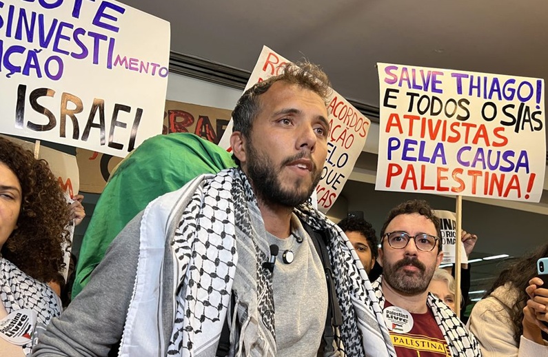 Thiago desembarcou no Aeroporto Internacional de Guarulhos, em São Paulo, e foi recebido por um grupo de militantes pró-Palestina, portando cartazes com mensagens de apoio ao país e bandeiras.