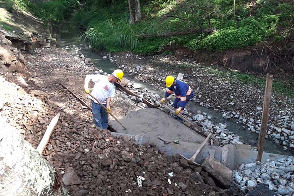 Equipe da Proguaru continuou executando nesta quinta-feira, 18, a construção de muro de contenção, no Córrego dos Cubas, no Jardim City. A ação vem ocorrendo após o desmoronamento do talude e da pista de caminhada existente no local devido ao rompimento da galeria de águas pluviais.