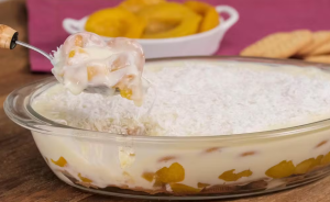 - Adicione os pêssegos picados e espalhe metade do creme por cima.