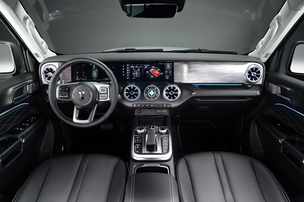 Por dentro, o GWM Tank 300 é um símbolo de sofisticação e conforto, com painéis das portas com costura padrão diamante, acabamento premium em soft touch, com console central climatizado para manter as bebidas frias ou aquecidas, aquecimento do volante de couro, que traz paddle shift integrado, e o som de alta fidelidade, com 9 alto-falantes e 640 W RMS de potência.