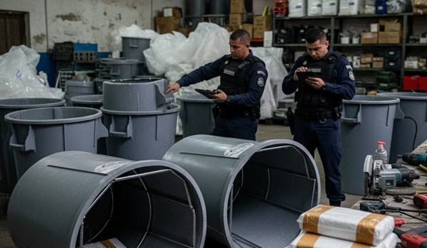 Segundo a PF, as lixeiras eram produzidas nesse imóvel e depois posicionadas em áreas próximas aos portões de embarque do aeroporto, com compartimentos internos criados para ocultar a droga. O entorpecente tinha como principal destino o mercado europeu.
