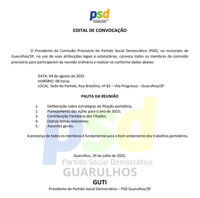 Publicações PSD publica edital de convocação para reunião ordinária Redação Guarulhos Web29 de julho de 2025 08:32 O Diretório Municipal do PSD de Guarulhos publica o edital de convocação para reunião ordinária Artigos Relacionados Publicações PSD Guarulhos divulga Edital de Convocação 8 de outubro de 2025 16:58 Educação • Publicações Cursos técnicos do ENIAC: a porta de entrada mais próxima para o mercado de trabalho 28 de fevereiro de 2023 10:22 Cidades • Publicações Já parou para pensar nos riscos dos cabos de energia elétrica partidos? 25 de outubro de 2021 14:44 PSD publica edital de convocação para Reunião Ordinária Associação Rhynos publica edital de convocação para assembleia geral Compartilhar FacebookXPinterestLinkedIn Outras Notícias Operação Cata-Treco vai a sete bairros de Guarulhos neste final de semana Fogo em esteira de bagagem faz passageiros serem retirados de avião no Aeroporto em Guarulhos Vôlei Guarulhos recebe o Sada Cruzeiro nesta segunda-feira pela Superliga Lucas ignora decisões do TJ e recorre ao STJ para tentar manter show no Cecap Final de semana será de tempo firme e temperaturas amenas em Guarulhos Confira os melhores caminhos de trânsito em Guarulhos nesta sexta-feira