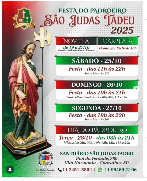 O Dia de São Judas Tadeu, comemorado em 28 de outubro, será repleto de celebrações, com missas às 6h, 7h, 10h, 12h, 15h, 18h e 20h, além da festa das 8h às 21h.