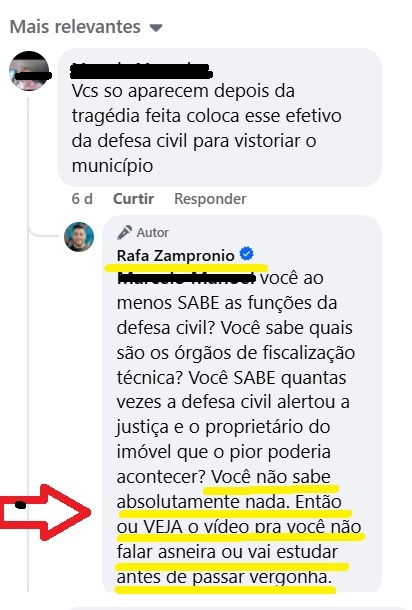 Um cidadão fez o seguinte comentário: “Vcs so aparecem depois da tragédia feita coloca esse efetivo da defesa civil para vistoriar o município”. Em seguida, aparece a réplica do coordenador de Lucas Sanches: “Você ao menos SABE as funções da defesa civil? Você sabe quais são os órgãos de fiscalização técnica? Você SABE quantas vezes a defesa civil alertou a justiça e o proprietário do imóvel que o pior poderia acontecer? Você não sabe absolutamente nada. Então ou VEJA o vídeo pra você não falar asneira ou vai estudar antes de passar vergonha”.