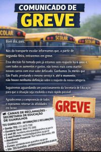Circula nas redes sociais comunicado assinado por um grupo de transportadores escolares que prestam serviços para a rede municipal de ensino anunciando que eles irá inicia uma greve na próxima segunda-feira, dia 6.