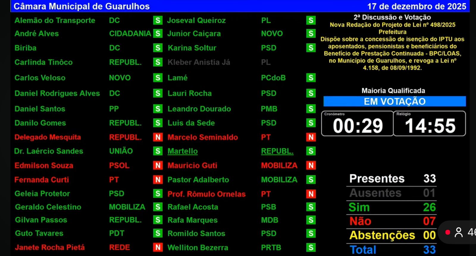 Agora, com, Lucas limitará o benefício apenas a quem ganhar até dois salários mínimos, o que significa que quatro mil aposentados de Guarulhos que gozavam de 100% de desconto terão apenas 50% ou 30% de isenção dependendo da faixa de renda. A lei aprovada altera de forma significativa a política de isenção do IPTU para aposentados, pensionistas e beneficiários do BPC/LOAS em Guarulhos.